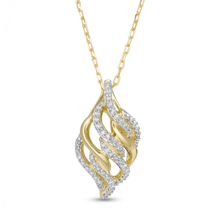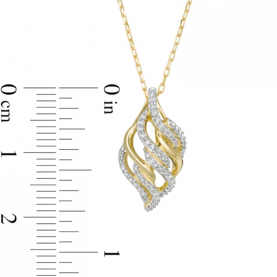 This diamond pendant is a champion of style. Fashioned in warm 10K gold, this open-worked design showcases a flame-shaped motif of polished and diamond-lined ribbons. Captivating with 1/5 ct. t.w. of diamonds and a brilliant buffed luster, this pendant suspends along an 18.0-inch cable chain, with an additional closure ring at 16.0 inches, that secures with a spring-ring clasp. This exclusive fine jewelry collection inspires you to wear your strength, confidence and power.